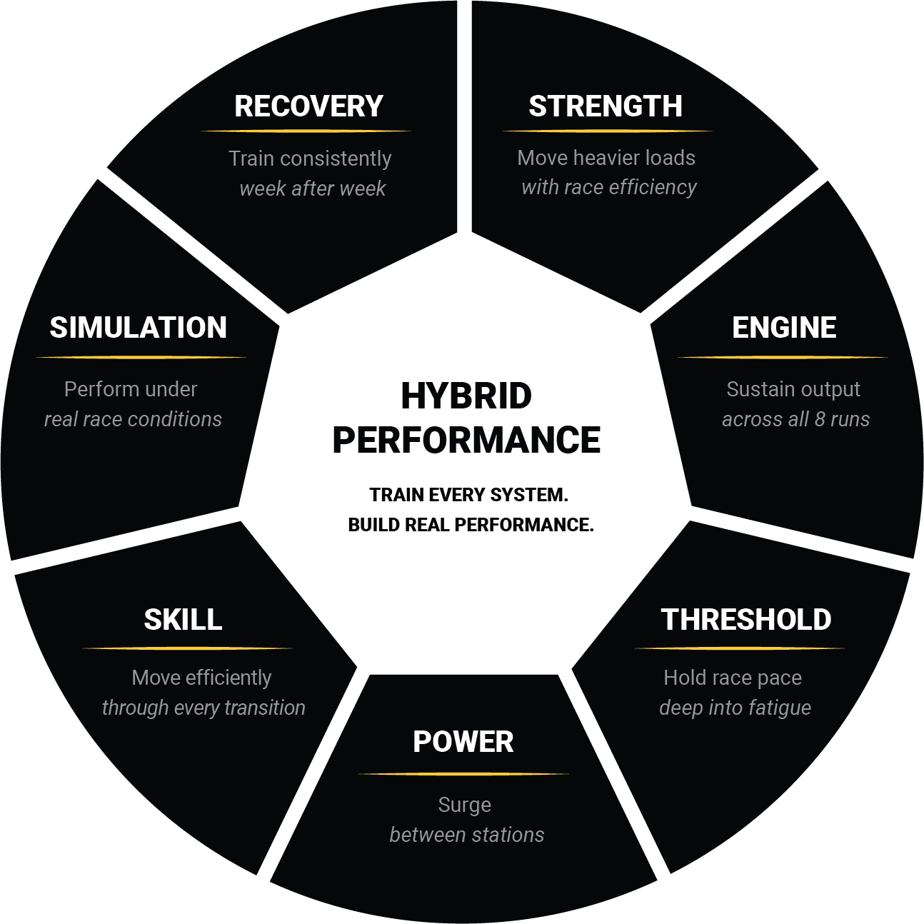 The Soultrain Performance Method™ is the structured training model that develops hybrid performance by integrating strength, engine, threshold, power, execution, and recovery. Each component builds on the next, ensuring balanced progression, sustainable training, and long-term performance.
